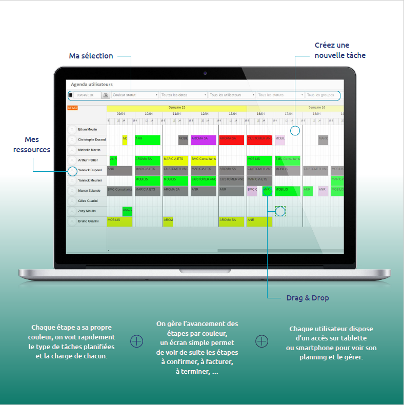 Le planning est simple mais complet et permet de suivre facilement les disponibilités, l’avancement des dossiers, les réaffectations de taches et le tout en un seul endroit.